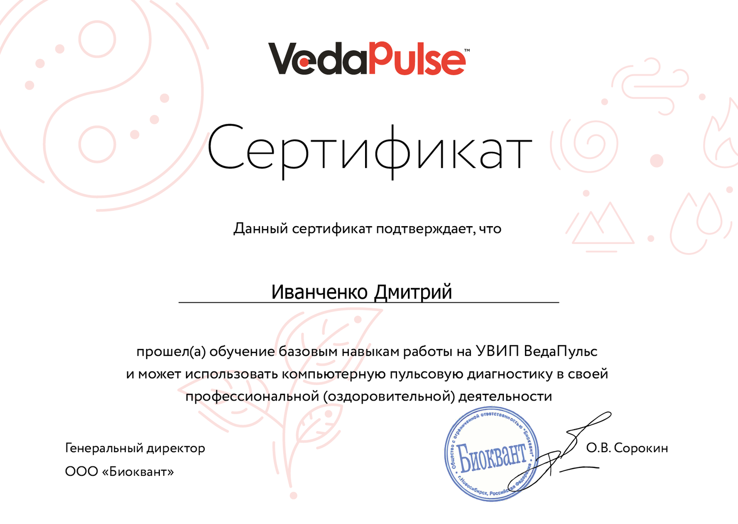 Методика «ВедаПульс» позволяет диагностировать состояние физического, психологического и энергетического здоровья человека, а также составить индивидуальные рекомендации по оздоровлению (рекомендованные продукты, наиболее подходящие занятия, фитопрепараты, ароматерапия, самомассаж по лучшим для Вас биологически активным точкам).