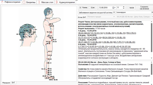Аппарат ВедаПульс формирует индивидуальный подбор акупунктурного рецепта для реабилитации по электропунктуре, лазеропунктуре биологически активных точек с учётом конституциональных и биоритмологических особенностей пациента.